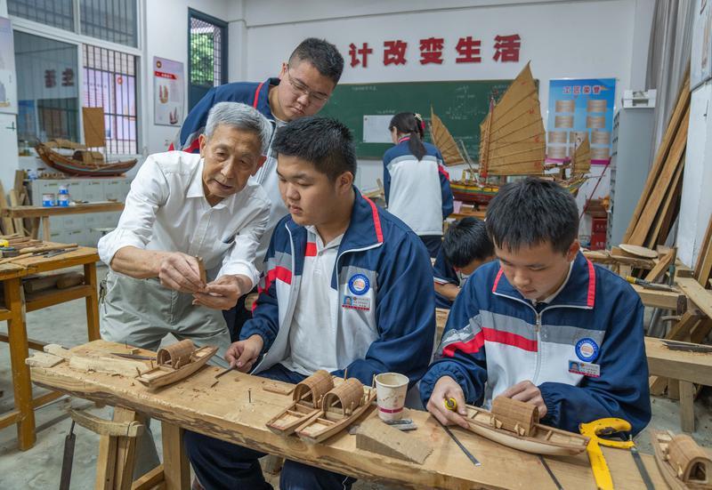 船模的价值不止于橱窗。2014年,郑文祥走进福安职业技术学校开设船模兴趣班。“造船工序复杂,过去靠师徒口耳相传,缺乏系统记载。”为此,他编写了《传统木帆船制作技艺》,以图文定格濒临失传的智慧。年事虽高,授课依然一丝不苟。“福安木船的辉煌,不能就这样湮灭。我们不去传,后人就看不到了。”当年轻学子对着精巧船模发出惊叹,老人眼中满是欣慰——那好奇的目光里,藏着技艺重生的火种。薪火相传,儿子郑瑞程也已接过了接力棒。