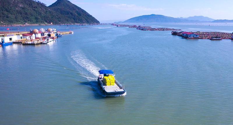 渔民驾驶电动渔业辅助船投喂饲料。