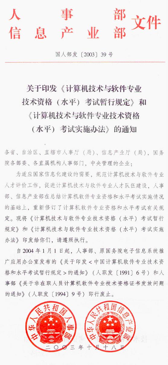 第一条 计算机技术与软件专业技术资格(水平)考试(以下简称计算机专业技术资格(水平)考试)在人事部、信息产业部的领导下进行,两部共同成立计算机专业技术资格(水平)考试办公室(设在信息产业部),负责计算机专业技术资格(水平)考试实施和日常管理工作。