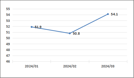 1-3月,业务总量指数先降后升。1月业务总量指数走低,2月份继续回落,3月份回升至54.1%(见图3),平均值为52.3%,同比提高0.7个百分点。