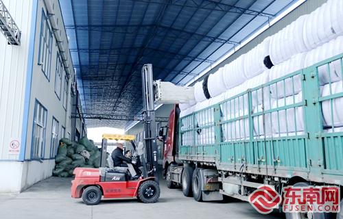 闽松纤维科技公司园区内,工人将纤维产品装载入货车,发往全国各地。