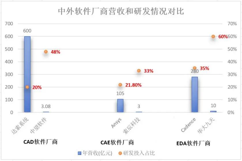 公开数据显示,在研发设计类软件(CAD)市场中占据最大市场份额的法国达索系统年营收约60亿欧元,研发投入占比约为20%;而同赛道的中望软件营收仅3.08亿元,研发投入占比高达48%。美国工业仿真软件(CAE)领军企业Ansys在被Synopsys收购之前,年营收约为15亿美元,研发投入占比达21.8%;而同赛道的索辰科技年营收约为3亿元左右,研发投入占比达33%。美国EDA头部厂商Cadence年营收约为40亿美元左右,研发投入占比约为35%;而同赛道的华大九天年营收约为10亿元,研发投入占比约为60%。这就是周子学所说“本土软件厂商正在加快自主创新”的最佳注脚。